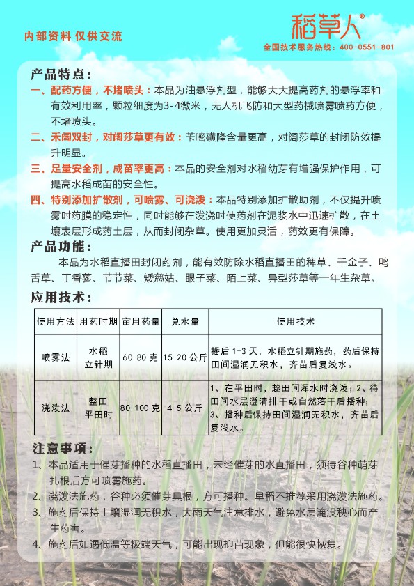 40%芐嘧·丙草胺OD ,48%丙草·丙炔·噁EC, 60%吡嘧·丁草胺OD,20%噁草·丁草胺EC,10%吡嘧磺隆WP,10%芐嘧磺隆WP,50%二氯喹啉酸WP